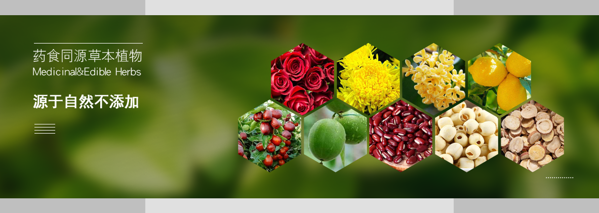玫瑰、菊花、金銀花、桂花、玫瑰茄、陳皮、檸檬、生姜、黃精、玉竹、人參、葛根、蛹蟲草、山藥、紅棗、桂圓、枸杞、山楂、羅漢果(青羅漢果和干羅漢果)、桑葚、白果、百合、酸棗仁、決明子、薏苡仁、茯苓、肉桂、赤小豆、蓮子、荷葉、甘草、薄荷、淡竹葉、顯齒蛇葡萄葉(藤茶)等藥食同源植物。